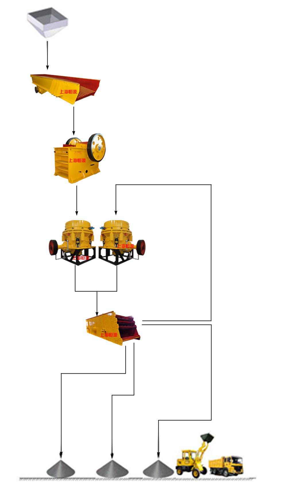 石料由振动给料机均匀地送到颚式进行粗破,粗破后的物料由胶带输送机送入到粗碎圆锥破进行进一步破碎,破碎后的物料被输送到振动筛进行筛分,达到成品粒度要求的物料通过胶带运输机输送到成品料堆;未达到成品粒度要求的物料从振动筛返回中碎或细碎圆锥破加工,形成闭路循环。成品粒度可按用户的需求进行组合和分级。