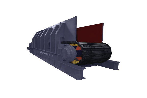 采用节距为228.6mm(9吋)的高强度推土机模锻链条为牵引件,两根链条绕过安装在机体头部的一对驱动链轮和机体尾部的一对张紧轮联成封闭形回路,在两排链条的每个链节上装配了相互交迭的、重型结构的输送槽而成为一个连续的能够运载物料的输送线路。其自重和物料的重量由安装在机体上的多排支重轮、链托轮和滑道梁支承。传动系统经交流变频调速电动机联接减速机,再由涨套与驱动装置直联驱动运载机构低速运行。将尾部料仓卸入的物料沿输送线路运至机体的前方排出,实现向下方的工作机械连续均匀喂料的目的。